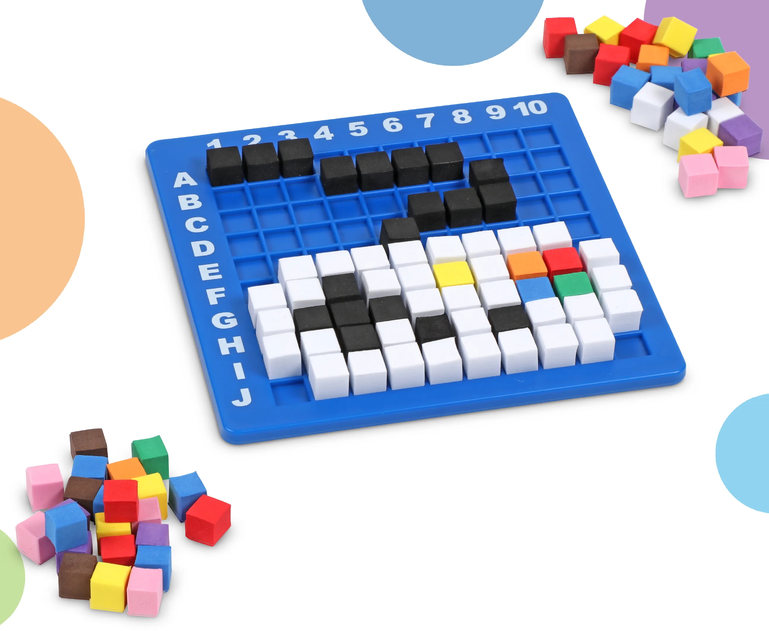 - Børnene udfylder simple pixelmønstre med farvede brikker eller tuscher.